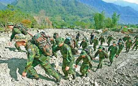 臺空軍T-34C教練機(jī)失事進(jìn)入第2天,27日臺軍方持續(xù)在高雄縣那瑪夏附近山區(qū)展開陸、空搜索,臺陸軍特戰(zhàn)部隊全副武裝大規(guī)模徒步上山搜救。圖片來源:臺灣《中國時報》