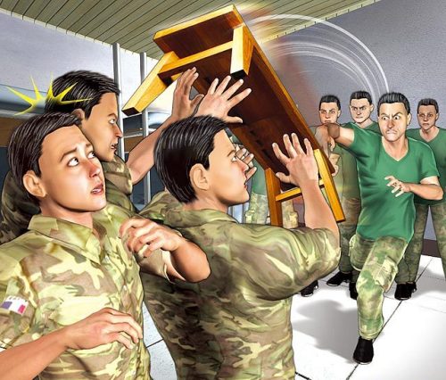 上月23日晚上8時(shí)許,許姓班長又要求新兵全部到中山室坐好,再玩起5分鐘一個(gè)動(dòng)作的訓(xùn)練,外號“水牛”的新兵當(dāng)場開罵,其他班長立即要求新兵回寢室,當(dāng)下雖有人回寢室,但卻有人留下來圍觀,還有人叫囂。過程中9名新兵有人將板凳砸向許姓班長,被其他班長擋下,也有人與班長推擠,沖突中多人掛彩。在場新兵形容“沖突狀況跟暴動(dòng)沒有兩樣”。此事驚動(dòng)臺軍連長、營長緊急出面處置,事態(tài)才沒有擴(kuò)大。
