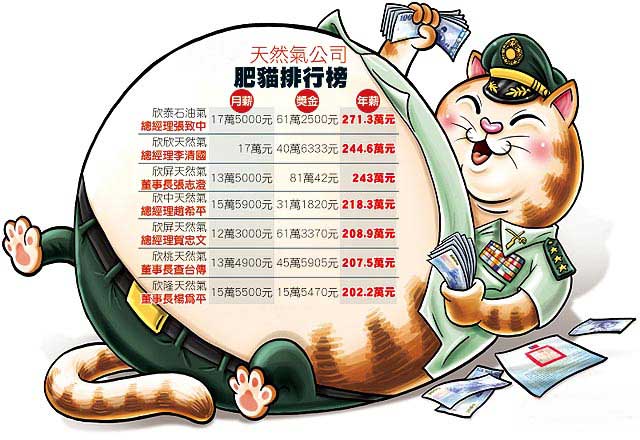 中國臺灣網4月26日消息 據臺灣媒體報道,島內天然氣價格居高不下,“立委”蕭美琴昨在臺灣“立法院委員會”公布“帝王肥貓排行榜”,質疑“退輔會”轉投資的天然氣公司官派董事長、總經理,“個個年薪都破百萬(新臺幣,下同)!”第一名是欣泰石油氣總經理、臺陸軍前少將張致中,年薪高達271萬元;臺陸軍前副總司令李清國中將任欣欣天然氣公司總經理,年薪244.6萬元居次。