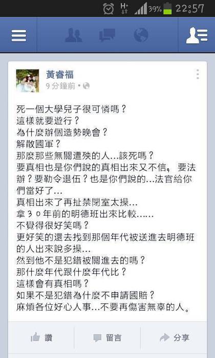 黃睿福po文表示“死一個大學兒子很可憐嗎?…要真相也是你們說的真相出來又不信,要法辦?要勒令退伍?也是你們說的…法官給你們當好了…真相出來了再扯禁閉室太操…拿30年前的明德班出來比較:不覺得很好笑嗎?更好笑的還去找到那個年代被送進去明德班的人出來說多操…然到他不是犯錯被關進去的嗎?那什么年代跟什么年代比?這樣會有真相嗎?如果不是犯錯為什么不申請‘國賠’?麻煩各位好心人事…不要再傷害無辜的人!