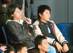邱毅念國二的女兒(左)和小六的兒子(右)陪他進棚,兩人和爸爸像好友。