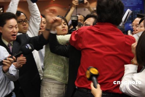 國民黨“立委”李慶華在臺當局“立法院”進行程序發言時,民進黨“立委”邱議瑩在臺下表達不滿意見,引發李慶華不滿,要邱議瑩“有點家教”,邱議瑩(左四穿白衣女性)與李慶華(穿紅衣男性)爆發口角,并突然從后面打李慶華一巴掌。 中新社發 耿軍 攝