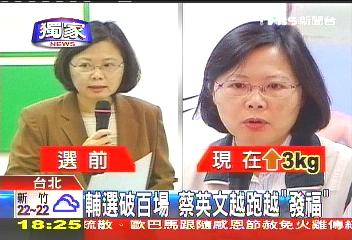 中國臺灣網(wǎng)11月26日消息 島內(nèi)“三合一”選舉進(jìn)入最后沖刺階段,民進(jìn)黨提名的候選人有的似“煙燻縮水”,有的像“烤焦脫水”,體重是紛紛下降。不過有個人體重卻“逆勢成長”,民進(jìn)黨主席蔡英文輔選跑透透,一個月行程破百場,卻可以“心寬體胖”,增加3公斤。