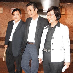 藍(lán)營不分區(qū)民代羅淑蕾(右)經(jīng)常在媒體麻辣發(fā)言,引發(fā)國民黨內(nèi)基層反彈,國民黨秘書長金溥聰(中)29日傍晚約見羅,再與國民黨政策會執(zhí)行長林益世(左)三方會面后,金表示未來會定期和不分區(qū)民意代表交換意見。圖片來源:臺灣《中國時報》