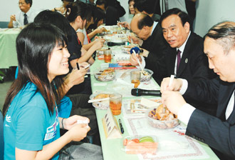 浙江省長(zhǎng)呂祖善昨參訪臺(tái)灣大學(xué),午餐時(shí)與臺(tái)大學(xué)生輕松地話(huà)家常。圖片來(lái)源:臺(tái)灣《聯(lián)合報(bào)》