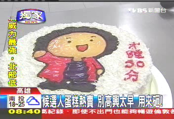 在蛋糕上勾勒出卡通人物模樣,戴眼鏡還比出手勢(shì),奇怪,這不是“南方小巨人”高雄縣長(zhǎng)楊秋興的公仔造型嗎?還不只如此,甚至還有陳菊的樣子,不過(guò)旁邊寫的居然是,難道睡覺(jué)30分鐘也有錯(cuò)嗎?真的沒(méi)看錯(cuò),臺(tái)灣五市選舉熱度延燒到甜點(diǎn)上面了。只不過(guò)這些蛋糕,最主要的功能卻是用來(lái)砸壞的,所以被畫在上頭的候選人,可別先高興太早,因?yàn)榻K究會(huì)被當(dāng)成發(fā)泄對(duì)象。