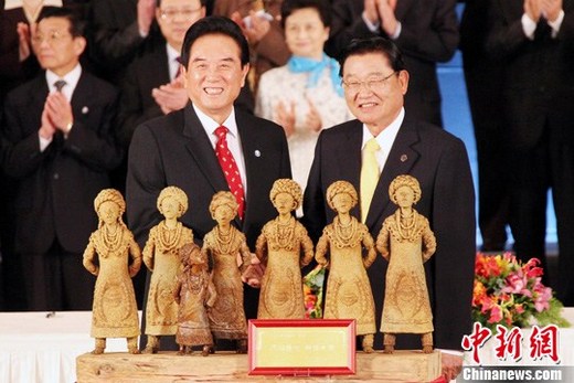 圖為協(xié)議簽署后,江丙坤向陳云林贈送的陶土雕塑“齊心傳唱和諧天籟”。該雕塑由著名藝術(shù)家張世蓉以臺東特有陶土雕塑,經(jīng)高溫?zé)贫桑憩F(xiàn)六位身著傳統(tǒng)慶典華服的排灣女子,齊心頌唱著兩岸和平、和諧之天籟美聲。中新社記者 黃少華 攝