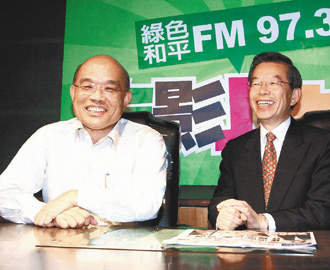 主持電臺(tái)節(jié)目的長(zhǎng)謝長(zhǎng)廷(右),昨天邀參選民進(jìn)黨主席的蘇貞昌(左)接受訪問,兩人互動(dòng)和樂。(圖片來源:臺(tái)灣《聯(lián)合報(bào)》)