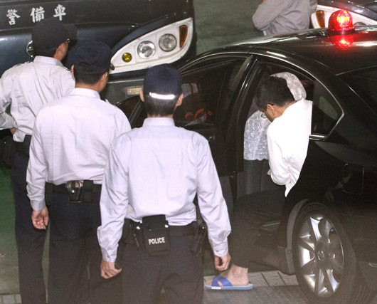 前臺當局“行政院秘書長”林益世(右)昨天遭臺特偵組依貪污罪起訴,并在警方的戒護下移審臺北地院開接押庭,林益世下車時刻意避開媒體鏡頭,以螃蟹橫行的方式進入地院開庭。 圖片來源:臺灣聯合新聞網