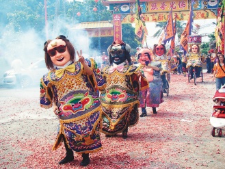 中新網(wǎng)2月16日電 據(jù)臺(tái)灣《聯(lián)合報(bào)》報(bào)道,“神明跳舞,超酷的!”屏東縣“合修會(huì)”電音童子團(tuán)15日到高雄縣甲仙鄉(xiāng)參加廟會(huì),戴上大墨鏡的每尊童子神像模樣可愛(ài),團(tuán)員們賣(mài)力地隨著電子音樂(lè),整齊跳著“新版臺(tái)中恰恰”,在場(chǎng)民眾掌聲沒(méi)間斷。