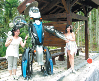 南投縣魚池鄉武登村民石凱倫創作的環保變形金鋼,吸引游客爭相留影。圖片來源:臺灣《聯合報》