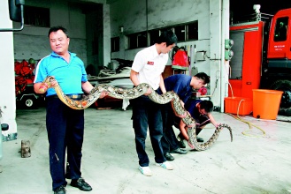 中新網8月31日電 據臺灣《聯合報》報道,屏東縣恒春消防隊30日抓到一尾長4.5米,重35公斤的網紋蟒。分隊長林坤玉說,首批前往捕蛇的2名隊員看到巨蟒,向隊部求援,增援2人才把它制伏,因巨蟒身上有被網割傷的傷痕,今天將送屏東科技大學野生動物收容中心治療。