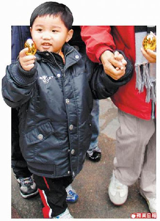 小朋友開心展示到南投竹山紫南宮排隊領到的金雞蛋。 來源:臺灣《蘋果日報》