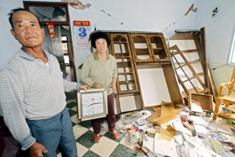 高雄縣甲仙昨天發生規模6.4級地震,杉林鄉受損嚴重,全倒及半倒民宅有30多間。一名民眾手里拿著停止走動的時鐘,心有余悸地描述地震發生時的情形。來源:臺灣《聯合報》