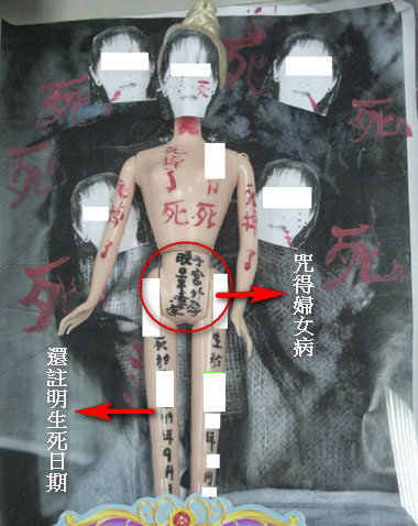 陳姓婦人懷疑丈夫外遇,涉嫌寫詛咒語在裸身芭比娃娃上恐嚇林姓女子,被臺警方查獲。 來源:臺灣《聯合報》