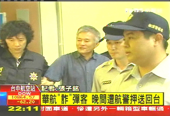 中國臺灣網(wǎng)5月5日消息 據(jù)臺灣TVBS電視臺報(bào)道,日前在臺灣華航飛往上海的班機(jī)上,聲稱自己的行李有炸彈的男子林南海,晚間被臺灣警方從杭州押送回臺。