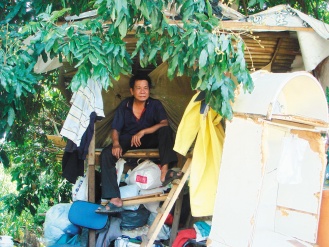 鐘德全(53歲)居住的樹屋只用簡單的木棚和蚊帳搭成,四周散亂著回收的破敗家具和瓶瓶罐罐,蚊蠅飛舞。鐘德全坐在樹下的舊沙發上,燒木炭煮稀飯吃,不時有野狗在他身邊嗅來嗅去。