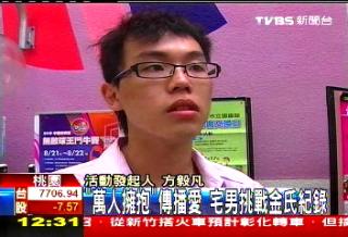 帶著粗框眼鏡、穿著襯衫的方毅凡,今年25歲,桃園人,從沒談過戀愛,生活里只有計算機,很少和人來往,是外人眼中的網絡宅男,這次發(fā)起“萬人擁抱”的活動,要在7月24日那天,在中壢龍崗大操場,挑戰(zhàn)吉尼斯世界紀錄。