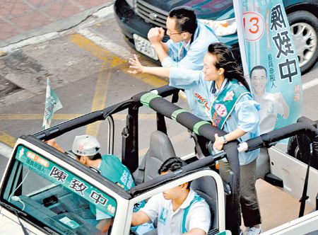 陳致中控告《壹周刊》案敗訴后,陳致中、黃睿靚夫婦昨日下午率車隊游街拜票,黃睿靚悲情催票“拉一把致中”。圖片來源:臺灣《中國時報》