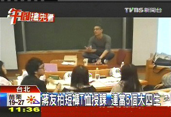 中國臺灣網(wǎng)4月25日消息 據(jù)臺灣TVBS電視臺報道,今年剛剛進(jìn)入臺灣亞洲大學(xué)教書的蔣友柏,已經(jīng)開除5個學(xué)生,日前還把學(xué)生們帶到自己的公司上課,穿短褲、T恤,還抽煙飆臟話,小腿上看來像刺青的圖案也很吸睛。不過學(xué)生們大都認(rèn)為,蔣友柏老師直接告知社會現(xiàn)實(shí)面,讓大家收獲很多。蔣友柏也稱這就是他最想教給學(xué)生的東西。