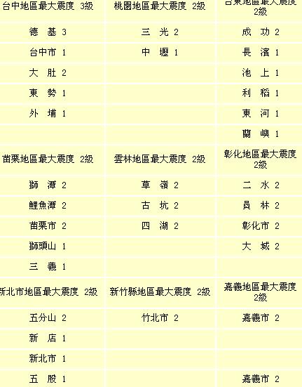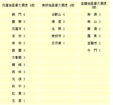 這起地震幾乎全臺有感,其它震度較大地區為花蓮市、宜蘭南澳3級;宜蘭市、臺東成功、臺中市、苗栗市、彰化市為2級;臺南市、新竹市、新北市、臺北市為1級。(中國臺灣網 馮存健)