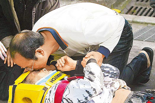 警方通知男子的兒子及媳婦,兩人到場(chǎng)跪地痛哭,救護(hù)人員在按壓男子胸口進(jìn)行急救時(shí),媳婦彷彿怕父親疼痛,流著淚直說:“不要再按了!”兒子則爬上前緊握父親的手,俯身親吻父親的額頭向他道別,在場(chǎng)警員見狀也忍不住鼻酸。