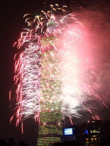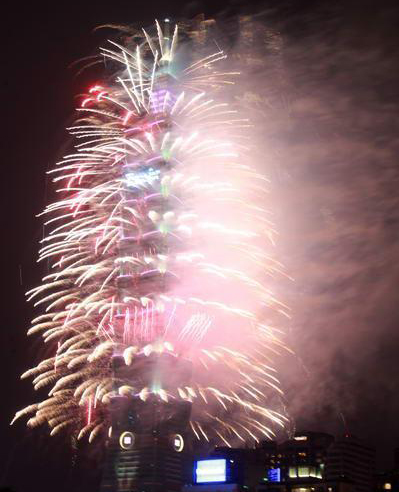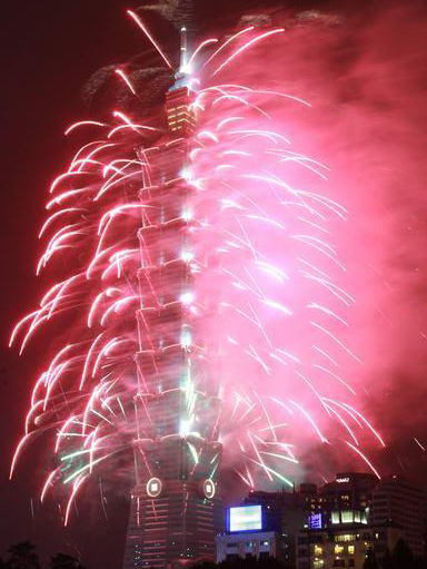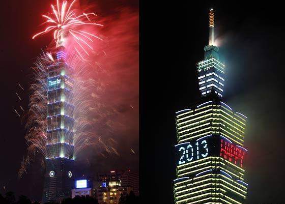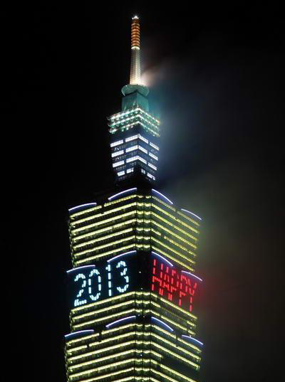 和去年一樣長達(dá)188秒的2013臺(tái)北101跨年煙火秀精彩登場,估計(jì)有85萬人到場觀賞。圖片來自臺(tái)灣今日新聞網(wǎng)