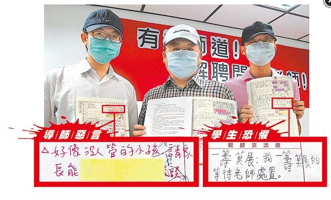 昨天3名家長在人本基金會陪同下開記者會,但3人怕身分曝光影響小孩,全程戴口罩,他們自嘲:“很沒種!學期結束才敢開記者會。”3人列舉廖姓男導師諸多不當管教實例,包括在家庭聯絡簿上稱學生“好像沒人管的小孩”、罵學生“過動兒、吃藥了沒?”當學生面前罵學生的媽媽是“白癡”等!