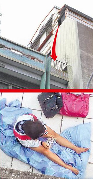 少女從5樓窗口跳到隔壁2樓陽臺(上圖箭頭處)摔斷腿,等待救援還不忘玩手機。(圖片來自臺媒)