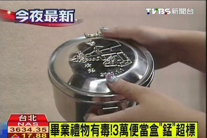 中國(guó)臺(tái)灣網(wǎng)8月1日消息 據(jù)臺(tái)灣TVBS電視臺(tái)報(bào)道,為慶祝幼兒園學(xué)生畢業(yè),新北市府發(fā)給3萬(wàn)名學(xué)童,一人一個(gè)不銹鋼便當(dāng)盒當(dāng)禮物,結(jié)果被測(cè)出錳含量超標(biāo)5倍。