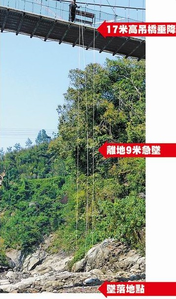 出事的苗栗縣騰龍吊橋高17米,女學生垂降到一半時,因繩索扣環松脫摔死。(臺媒圖)