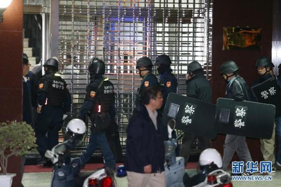 2月11日,警察聚集在高雄大寮監獄。臺灣高雄大寮監獄11日下午發生挾持事件,6名服刑人員搶奪槍支,挾持典獄長等人質,警方隨后派出逾200警力及特警荷槍實彈包圍監獄。截至22時,這6名服刑人員仍在與警方對峙,尚無人員傷亡。新華社發 圖片來源:新華網