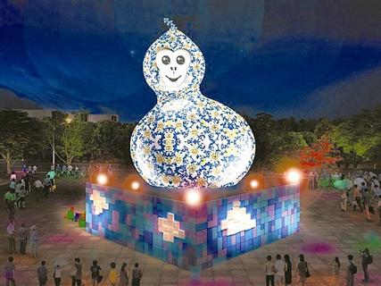 臺北燈節日前公布今年主燈造型,號稱史無前例推出不規則的光雕主燈“福祿猴”,外觀為“葫蘆”造型,取自傳統文化中葫蘆代表的“福祿”、“多子多孫好福氣”寓意,并將主燈依葫蘆諧音命名為“福祿猴”。主燈表面以氣泡膜作為材料,周圍使用可回收的泡沫塑料,打造臺北地景藝術裝置。由空中鳥瞰,就是臺北市的地圖縮影,希望借由燈節讓環保的概念成為生活藝術。