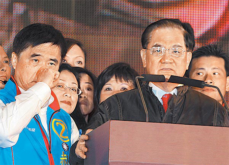 胡志強(qiáng)26晚在臺(tái)中洲際棒球場(chǎng)舉行的造勢(shì)晚會(huì)上,“立委”盧秀院宣布連勝文遭槍擊時(shí),現(xiàn)場(chǎng)一片驚愕,不敢相信這個(gè)消息。來(lái)源:臺(tái)灣《中國(guó)時(shí)報(bào)》