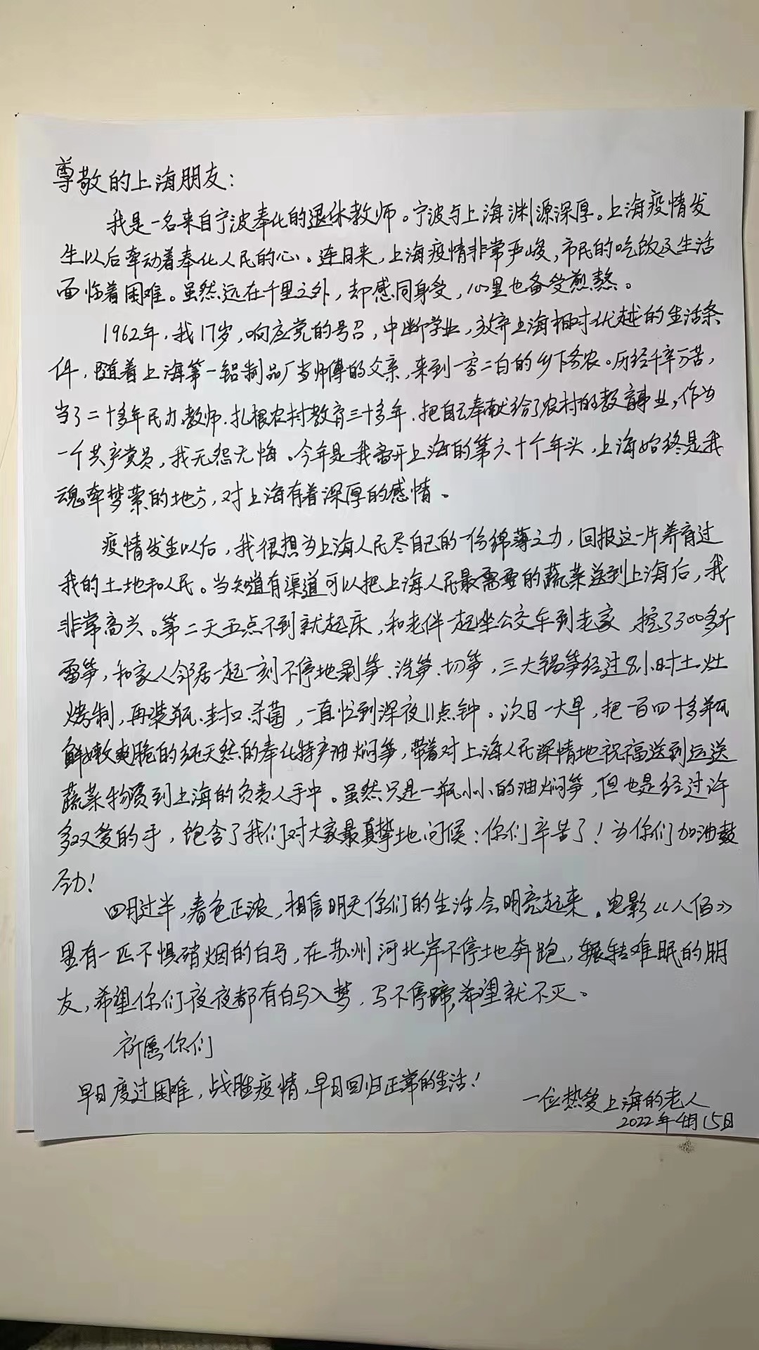 在信的最后,老人為上海人民送上了祝福。他提到,“四月過半,春色正濃,相信明天你們的生活會明亮起來。祈愿你們早日度過困難,戰勝疫情,早日回歸正常的生活!”