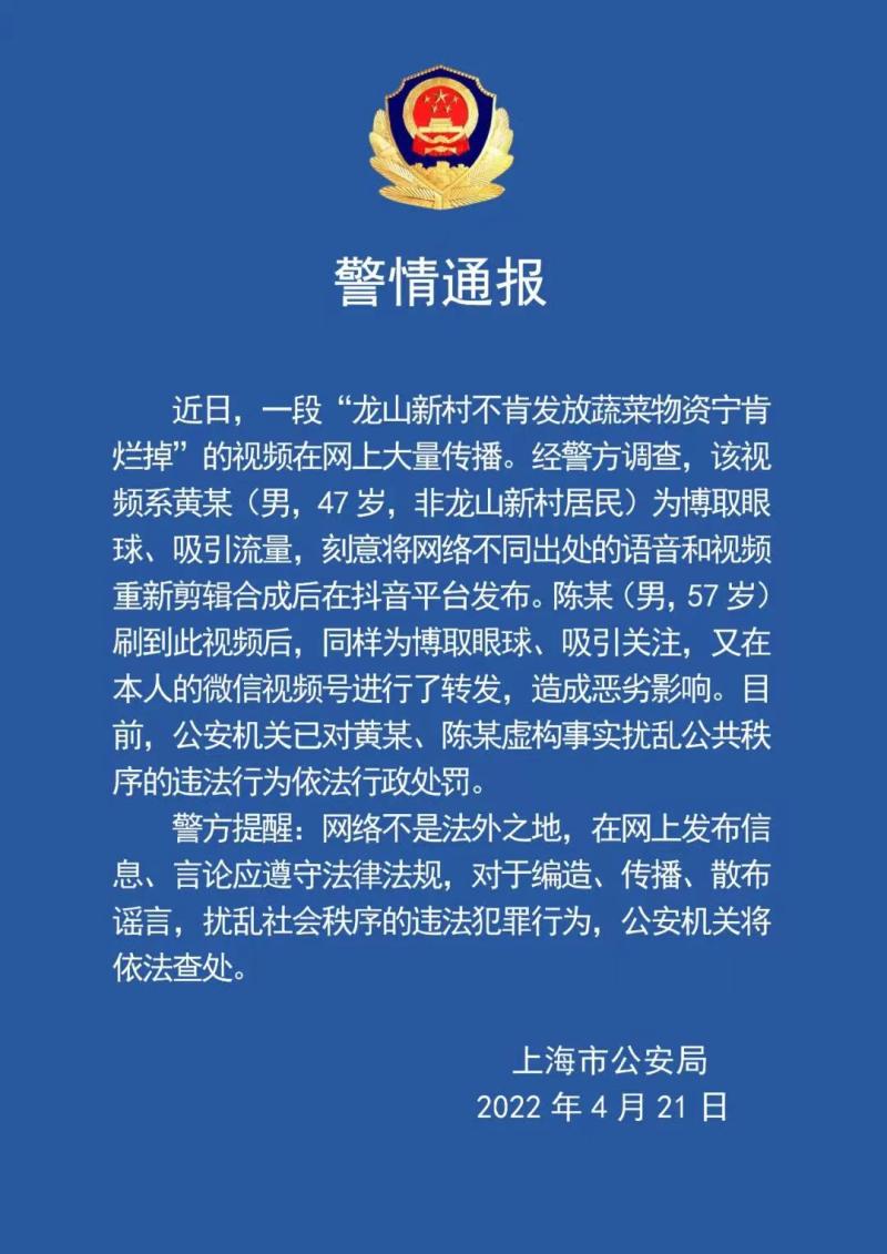 近日,一段“龍山新村不肯發(fā)放蔬菜物資寧肯爛掉”的視頻在網(wǎng)上大量傳播。經(jīng)警方調(diào)查,該視頻系黃某(男,47歲,非龍山新村居民)為博取眼球、吸引流量,刻意將網(wǎng)絡(luò)不同出處的語音和視頻重新剪輯合成后在抖音平臺發(fā)布。陳某(男,57歲)刷到此視頻后,同樣為博取眼球、吸引關(guān)注,又在本人的微信視頻號進(jìn)行了轉(zhuǎn)發(fā),造成惡劣影響。目前,公安機(jī)關(guān)已對黃某、陳某虛構(gòu)事實擾亂公共秩序的違法行為依法行政處罰。