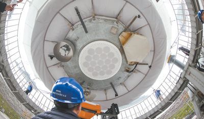 技術人員對“中國天眼”的饋源艙進行維護保養。新華社記者 歐東衢攝