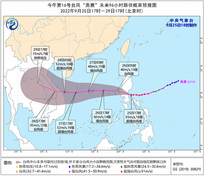 預(yù)計(jì),“奧鹿”將以每小時(shí)25公里左右的速度向西偏北方向移動(dòng),將于今天晚上在菲律賓呂宋島東部沿海登陸(48~55米/秒,15~16級,強(qiáng)臺(tái)風(fēng)級或超強(qiáng)臺(tái)風(fēng)級),今天夜間穿過呂宋島,強(qiáng)度有所減弱,26日早晨到上午進(jìn)入南海中東部海域,之后向偏西方向移動(dòng),逐漸向越南東部沿海靠近,強(qiáng)度還將有所加強(qiáng),28日早晨到上午在越南東部沿海登陸(48~52米/秒,15~16級,強(qiáng)臺(tái)風(fēng)級或超強(qiáng)臺(tái)風(fēng)級),登陸后強(qiáng)度快速減弱。中央氣象臺(tái)9月25日上午發(fā)布臺(tái)風(fēng)藍(lán)色預(yù)警。
