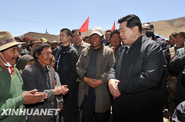 地震中,玉樹縣上拉秀鄉(xiāng)加吉娘社區(qū)23位村民喪生,160多間房屋倒塌。黨支部書記土丁朋措詳細(xì)介紹了抗震救災(zāi)情況。淳樸的藏民們圍攏到賈慶林身邊,賈慶林拉著他們的手,動情地說,請大家放心,黨和政府一定會千方百計幫助大家恢復(fù)生產(chǎn)、渡過難關(guān)。希望大家化悲痛為力量,在災(zāi)難中挺立,在困境中奮起,用我們的雙手重建美好家園,創(chuàng)造幸福生活。