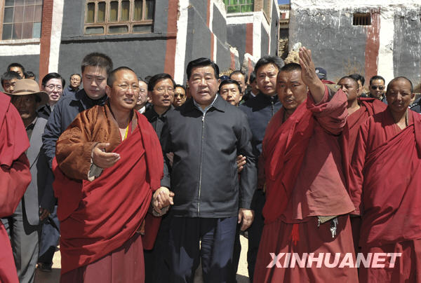 這是賈慶林在玉樹縣結(jié)古寺看望慰問宗教界人士。新華社記者黃敬文攝