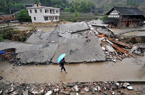5月7日,在新化縣奉家鎮(zhèn),一村民走過被洪水沖毀的房屋。5月6日凌晨至7日上午,湖南省氣象臺連續(xù)發(fā)出11個暴雨橙色預警信號,6個暴雨紅色預警信號。目前,湖南省有300余個鄉(xiāng)鎮(zhèn)遭遇強降雨。災情最嚴重的新化縣,已有5人死亡2人失蹤,38萬余人受災。當?shù)囟鄶?shù)學校已暫時停課,5300名學生回家避險。新華社記者 趙眾志 攝