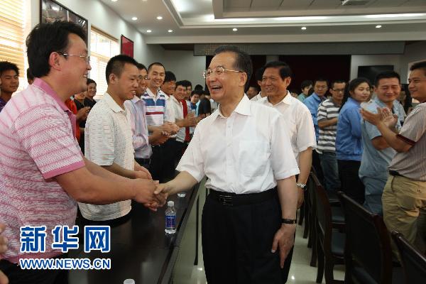 6月14日,在中華民族傳統佳節端午節來臨之際,中共中央政治局常委、國務院總理溫家寶先后來到北京市兒童福利院、西城區富國里社區、地鐵6號線平安里站施工工地,看望孤殘兒童和城市低保戶,了解農貿市場蔬菜供應和價格情況,召開新一代農民工座談會。這是溫家寶在北京地鐵6號線平安里站施工工地會議室召開新一代農民工代表座談會。新華社記者姚大偉攝