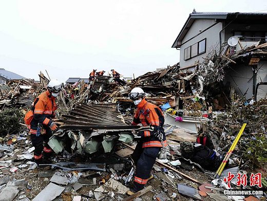 3月16日上午,日本救援隊伍在日本巖手縣大船渡市的“3.11日本東北大地震”引發(fā)的大海嘯襲擊后的災區(qū)進行搜救工作。中新社發(fā) 侯宇 攝