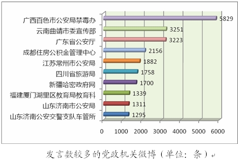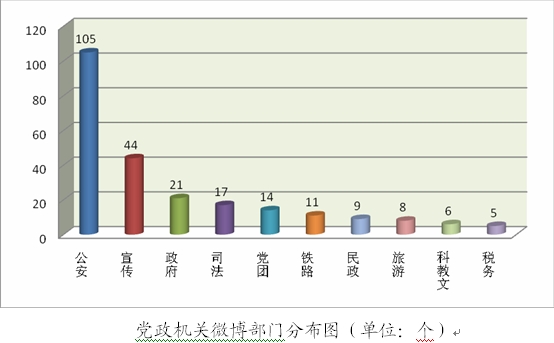 在黨政部門分布上,公安系統可謂一枝獨秀。早在2010年2月,廣東省公安系統便率先開設我國首批公安微博群。此后3個月內,廣東公安微博共發布信息近萬條,粉絲總數逾10萬人,評論總數超過3萬條。目前騰訊的廣東公安微博粉絲突破300萬,是中國目前粉絲數最多的政府網站。2010年7月,北京市公安局公共關系領導小組成立,北京市公安局長傅政華擔任領導小組組長。8月1日,“平安北京”黨政機構和官員微博在新浪網開通,20天訪問量即突破210萬人次。此后,全國各省市縣各級公安微博群相繼在人民微博、新浪微博、騰訊微博等平臺出現。據2011年1月30日公安部官方網站發布的準確數字,全國的公安微博已有800余家。公安微博不僅數量眾多,很多公安微博的總發言數也都居于前列。公安微博不僅在信息發布、警情通報、安全常識推廣等常規工作領域中服務于群眾,更多次在突發事件中大顯身手。黨政宣傳部門居于行業分布的次席,宣傳部門本身就承擔著信息發布與媒體管理的職能,微博客已經成為宣傳部門在傳統信息發布渠道之外的有益補充,有利于營造地方黨政良好形象和公信力。