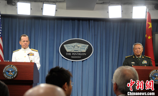 圖為陳炳德當(dāng)日與美軍參謀長聯(lián)席會議主席馬倫在五角大樓舉行聯(lián)合記者會。中新社發(fā) 吳慶才 攝