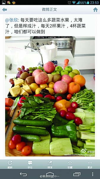 @張欣(潘石屹妻子):每天吃這么多水果蔬菜太難,但是榨成汁,每天2杯果汁,4杯蔬菜汁,咱們都可以做到。