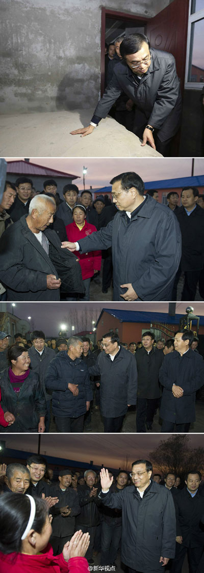據新華社“新華視點”微博報道,天色漸晚,李克強來到銀川鄉幸福大院安置點,這里剛為受災特困戶和五保戶建起安置房。李克強說,黑龍江冬天冰天雪地,最怕冷。政府要安置好困難群眾,讓大家有地方住,溫暖過冬。冬天過暖和了,來年也一定有好春天,一定有好日子。