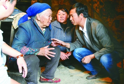 云南省曲靖市馬龍縣王家莊街道莊郎社區黨支部書記張炳才(右一)在了解81歲的許留英老人的生活狀況,為其制定精準脫貧方案。新華社發