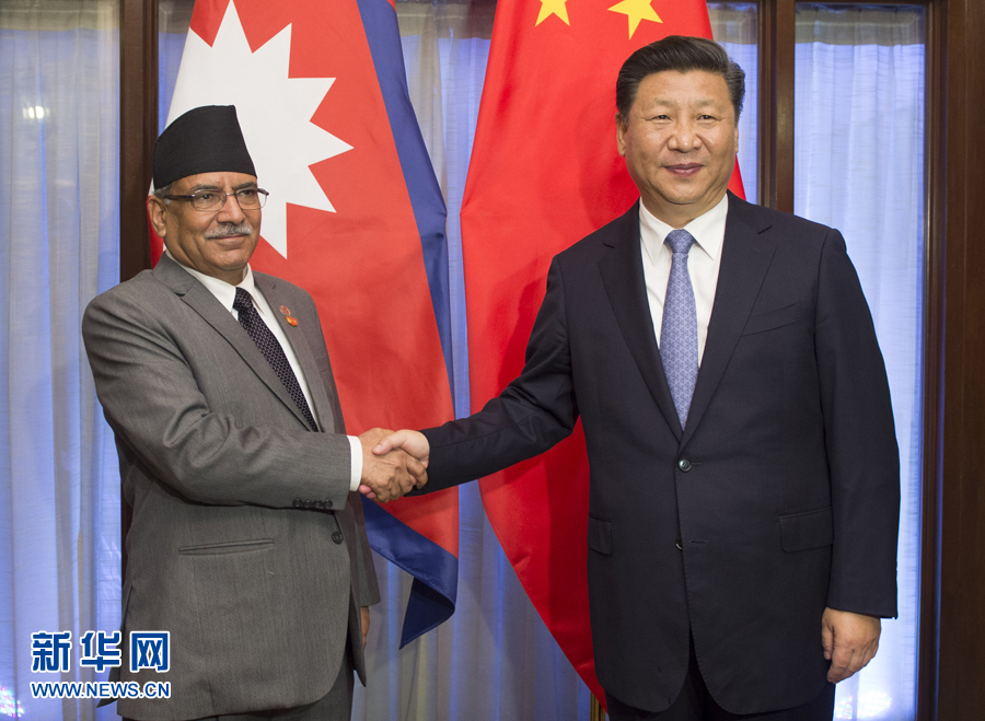 10月15日,國家主席習近平在印度果阿會見尼泊爾總理普拉昌達。新華社記者謝環馳攝