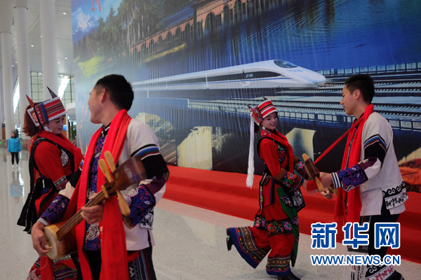 高鐵開通首日,少數(shù)民族代表在昆明南站載歌載舞。新華網(wǎng) 陳俊松 攝
